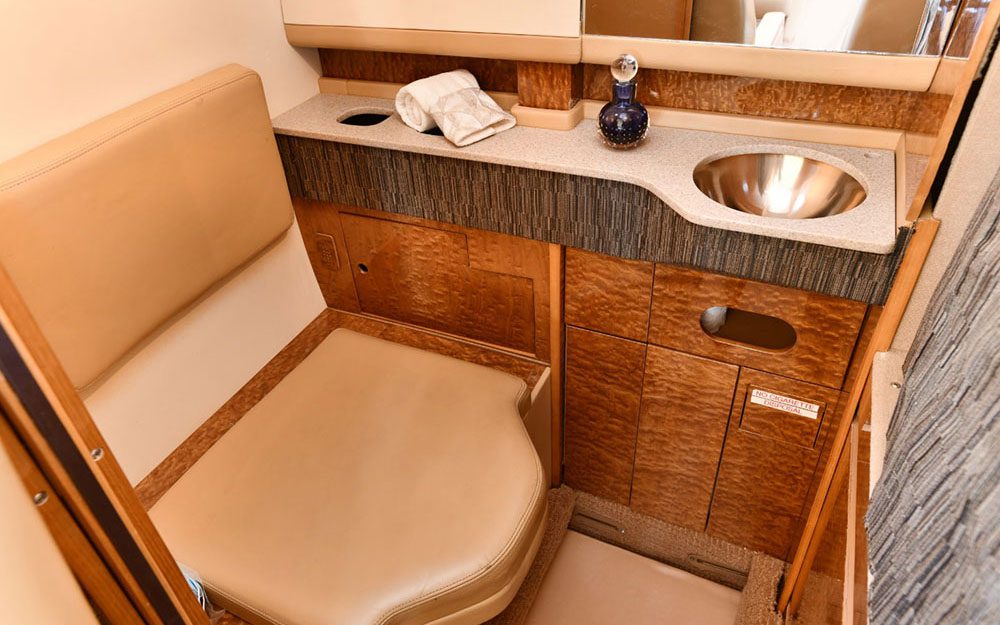 Standard (8) passenger forward club seating with 2 place side facing diva, with AFT 4 place club configuration, airshow moving map DVD/CD/MP3, two bulkhead monitors, forward galley, heated Mapco oven, ice, and storage. Beige leather passenger seats, with three stowable executive tables. The left and right-side ledges are high gloss wood veneer. The cabin headliner and window line covered in ultra leather. The sidewalls are tastefully accented in tapis pattern. The carpet is beige with floor runner. The right-side refreshment center has a