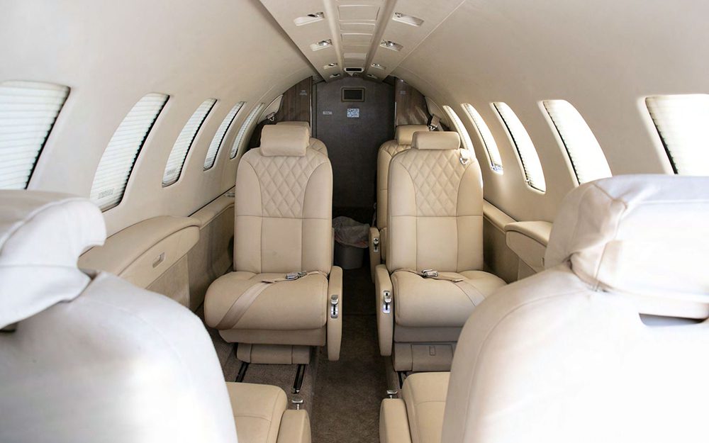 Seven (7) Passenger Interior Including Mid-Cabin Four Place Club Arrangement, Two (2) Forward Facing Aft Seats, and a Belted Lavatory All Completed in Beige Leather.