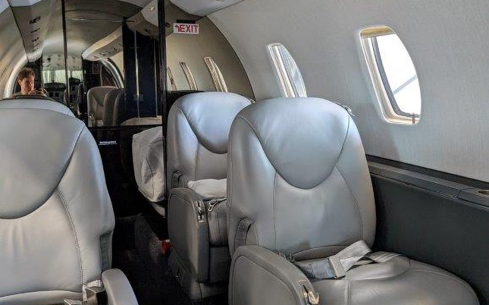 Nine (9) passenger interior, the forward cabin offers a Deluxe Refreshment Center opposite a two (2) place side facing divan followed by six (6) individual chairs which recline and swivel. All seating is completed in a Tan colored leather complimented medium high gloss cabinetry and Rose Gold colored plating. New style fully adjustable crew seats with reclining & lumbar support. Externally serviceable belted lavatory.