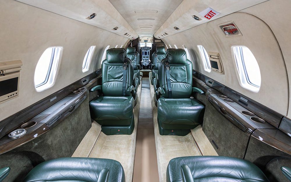 The Citation X features a forward right-hand galley, an Eight (8) passenger cabin with forward and aft Four (4) place clubs, an aft Lavatory, and a tailcone main baggage compartment. There are cockpit pocket doors and an aft cabin hinged door that separates the aft cabin and lavatory. Stowing executive tables are located at each Two (2) place club. The forward right-hand galley includes a countertop, dual hot liquid containers, warming over, divided ice drawer, and additional storage cabinets.