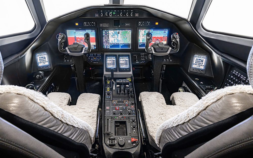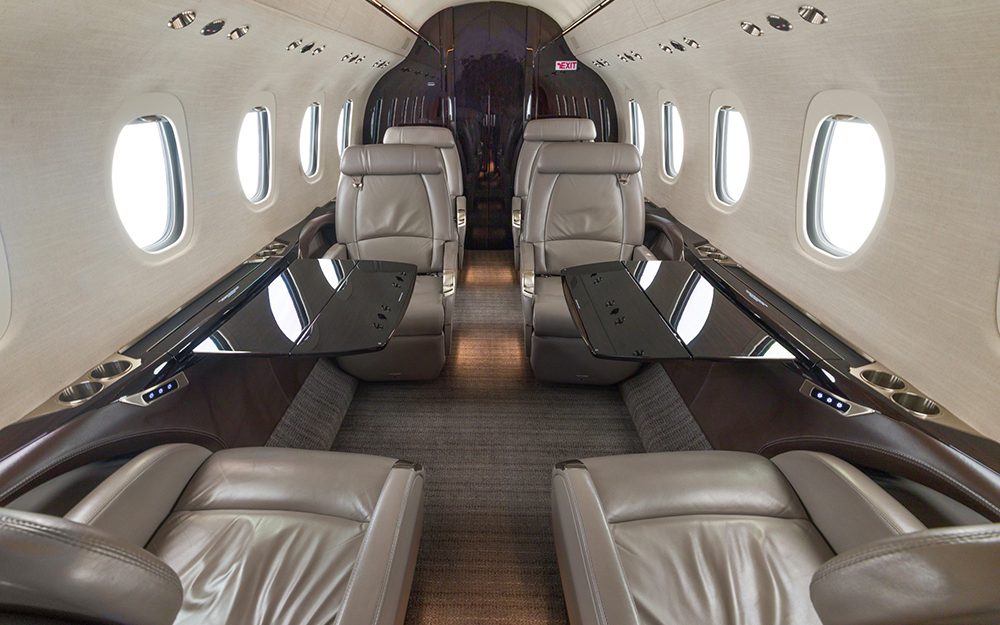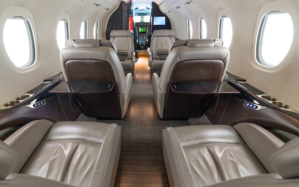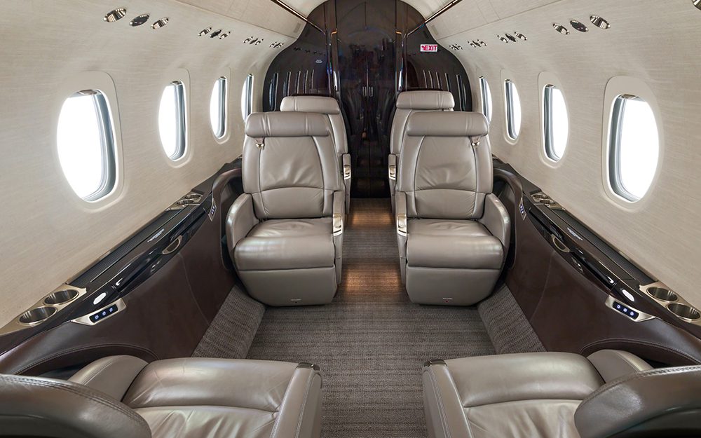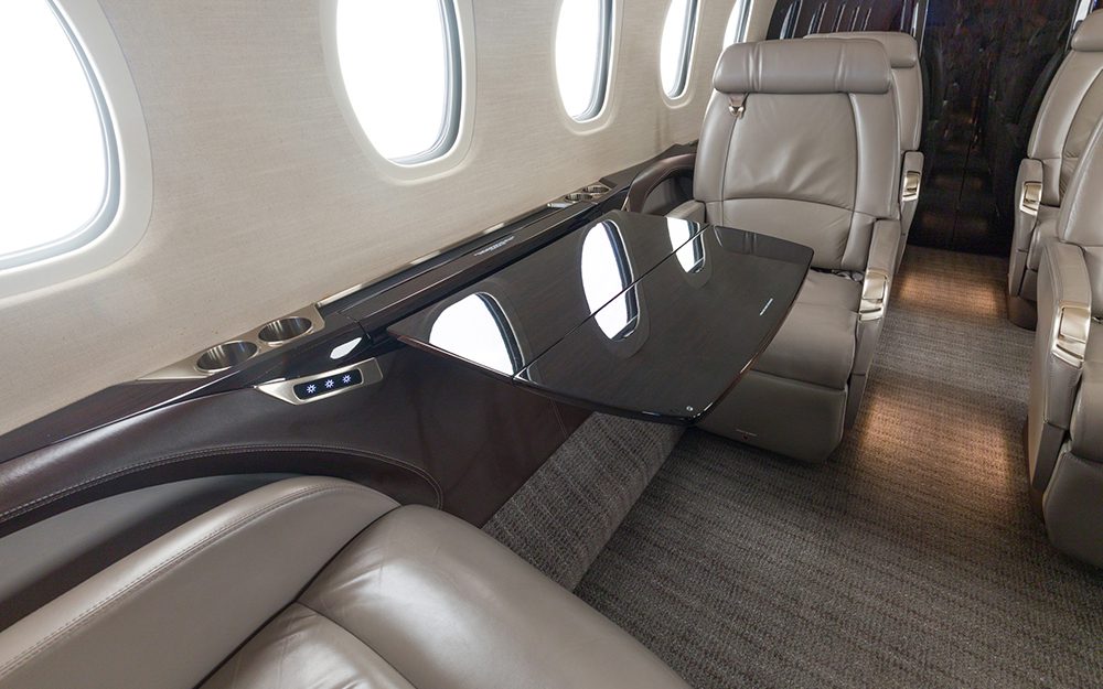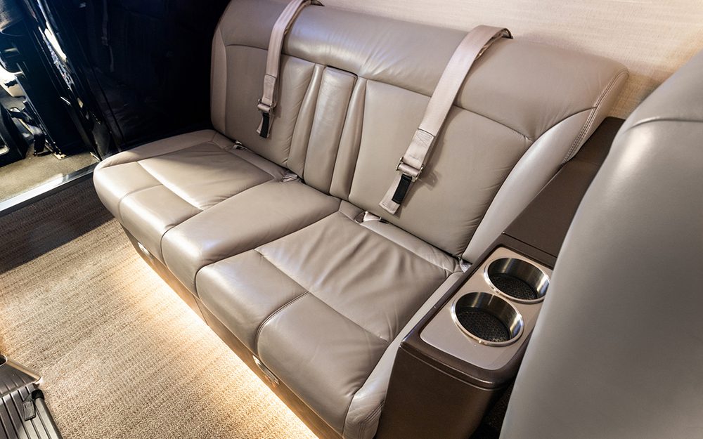 Well-appointed nine-passenger interior in overall Mink Grey leather. Six passenger seats in single club configuration with two aft forward facing seats, rightside forward twoplace couch, and leftside aft, single, side-facing seat in lav area. Espresso Brown lower sidewalls and Shadow Taupe