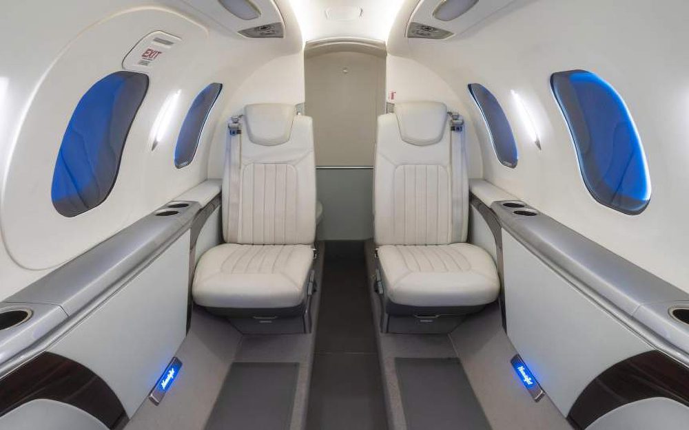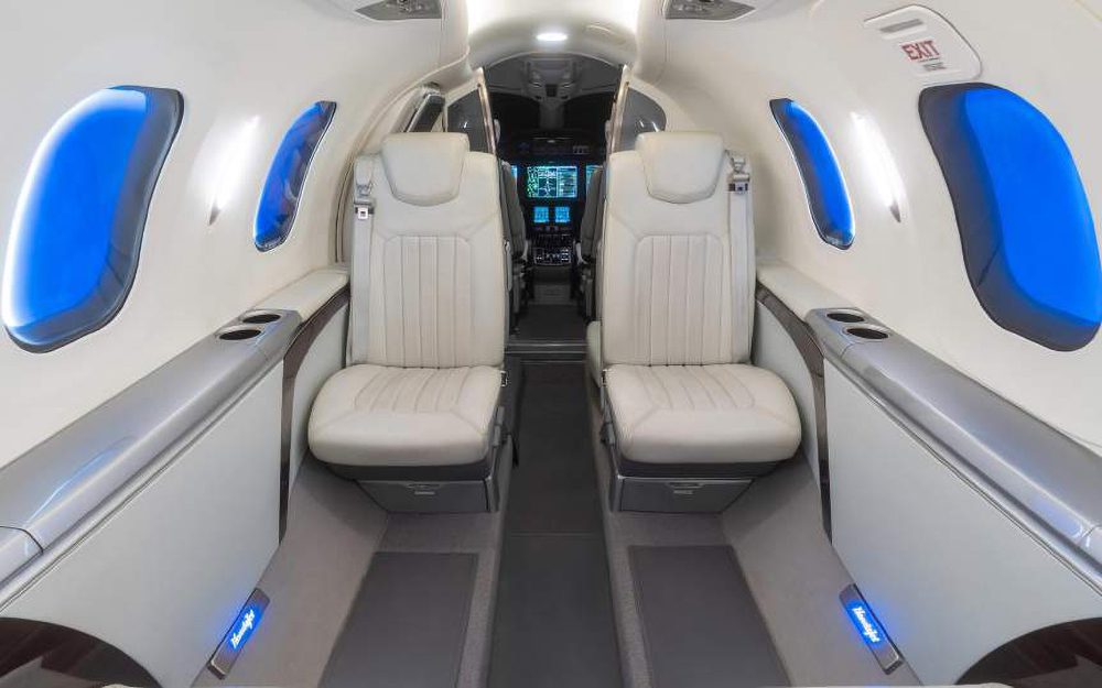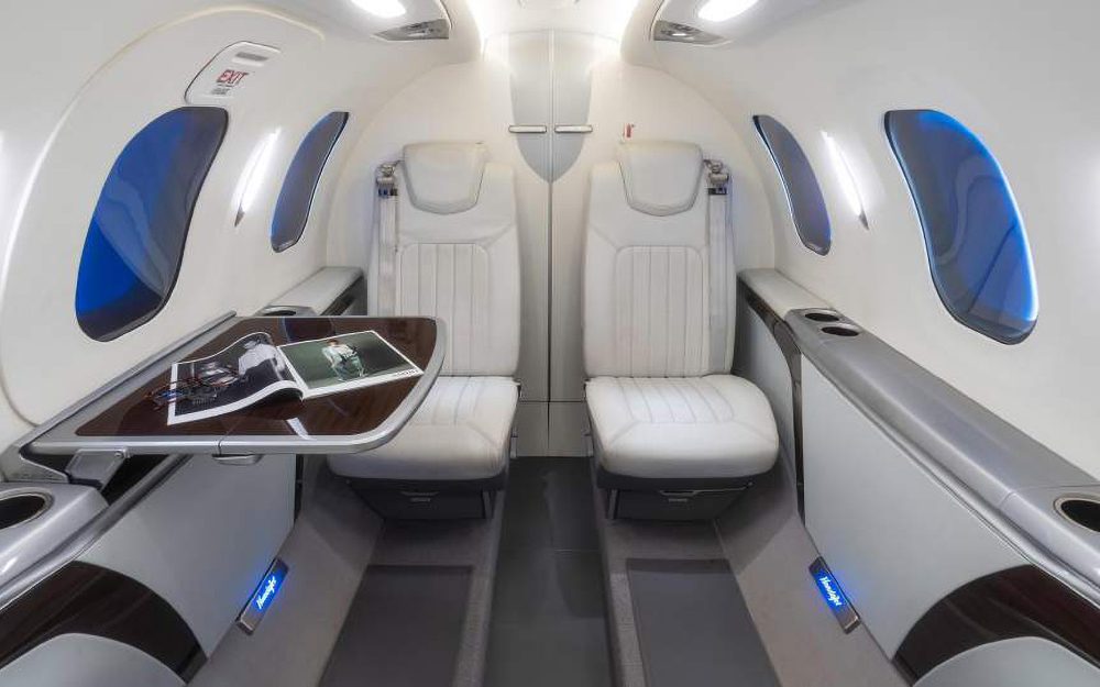 Cool gray monotone elite leather seating, forward side-facing seat, 4-place club with Dual stowable executive tables