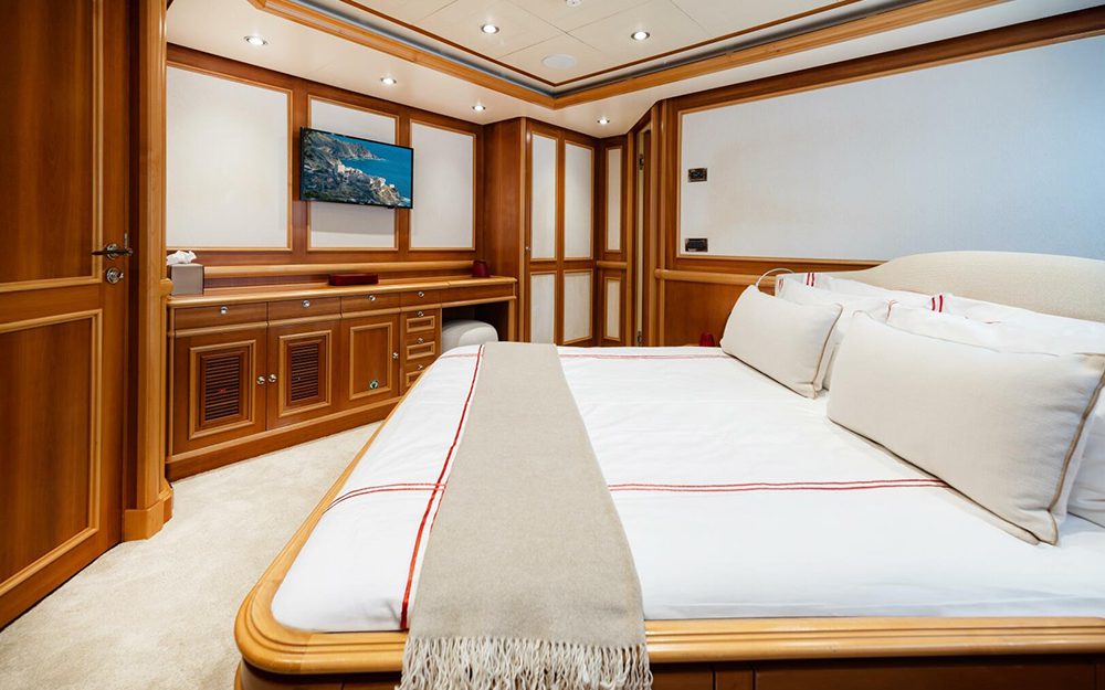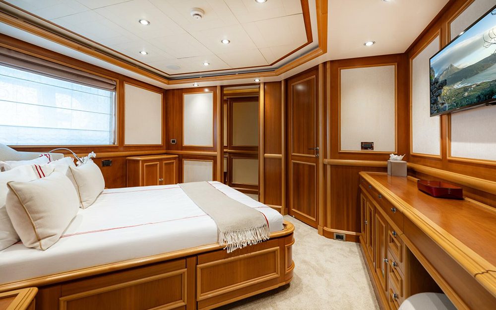 Access to the owner’s suite is from the starboard side foyer forward of the salon. The foyer has a private entry with stairs leading up to skylounge or down to the 4 guest suites.