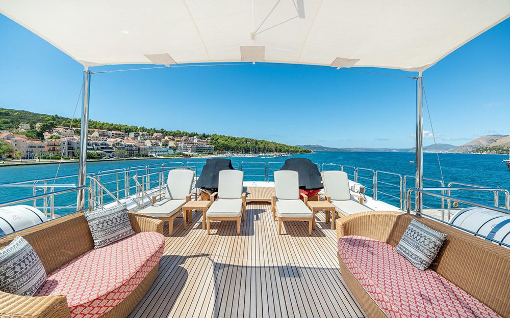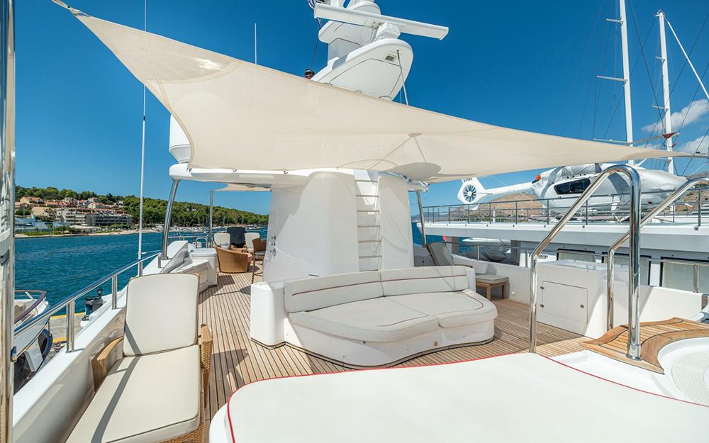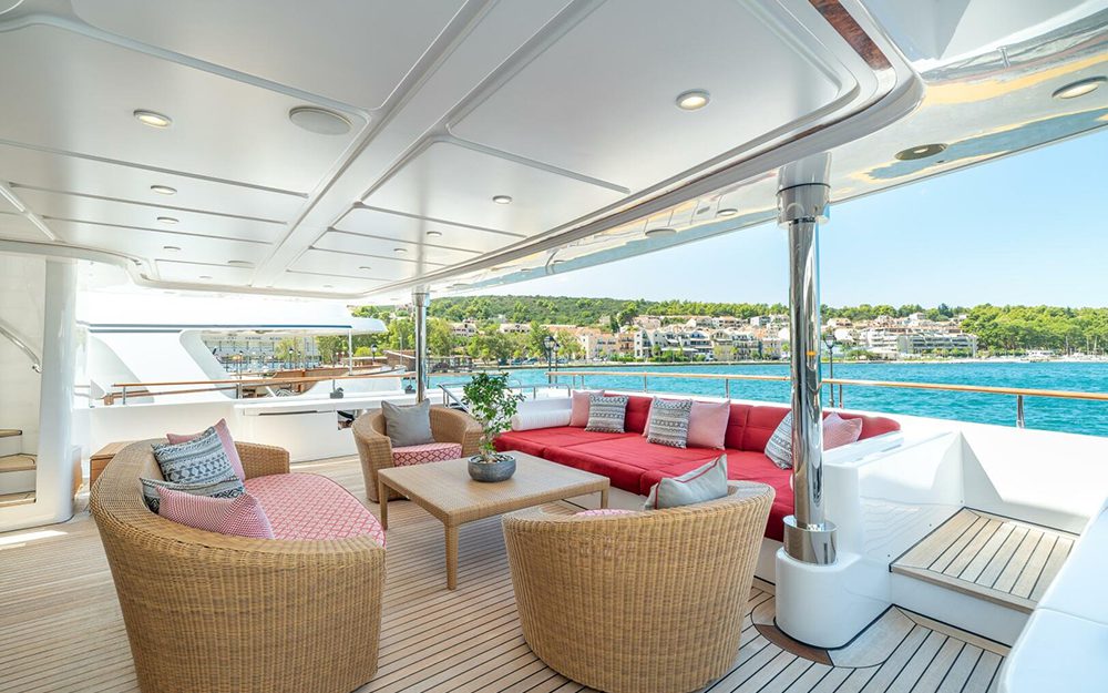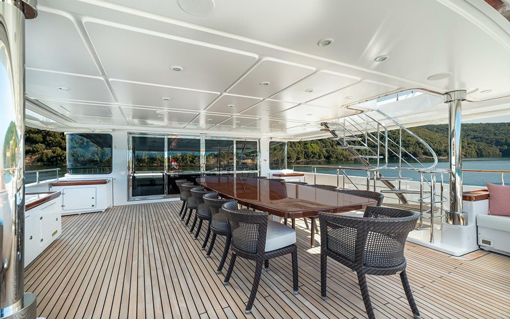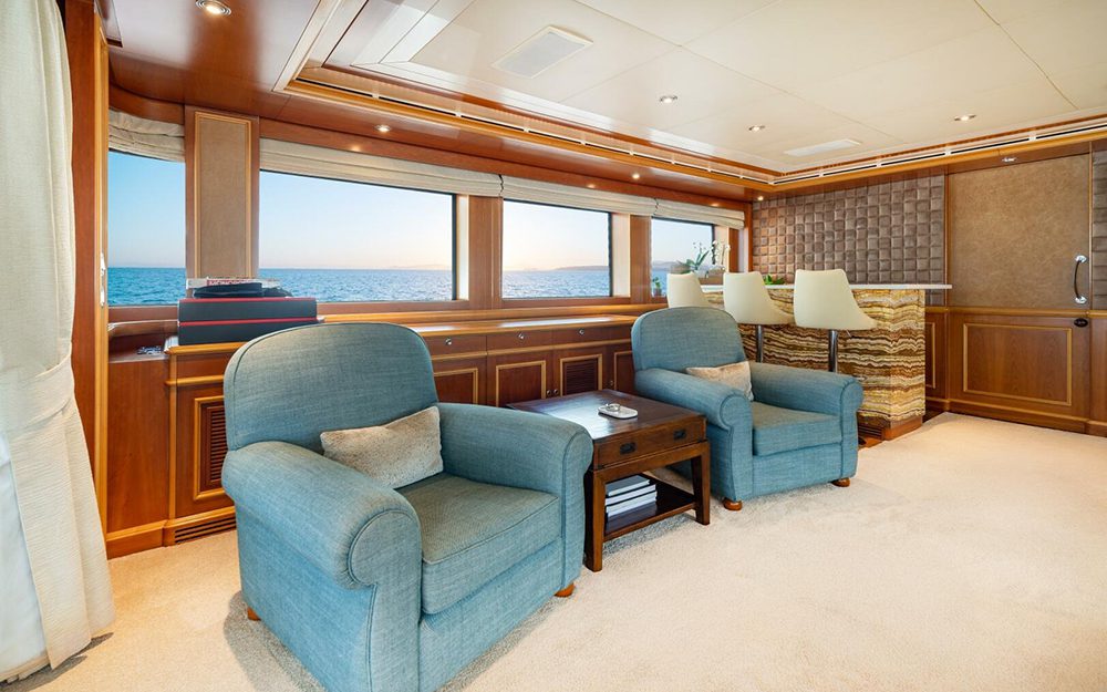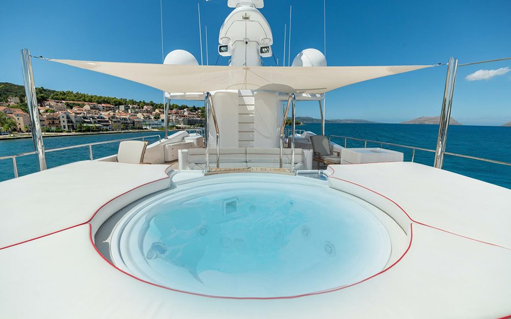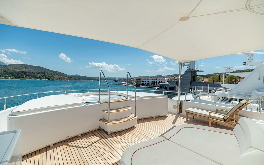 There is a lovely private balcony in the owner’s suite to the starboard side accessed with opening glass sliding doors, it has a private tub complete with plasma switched “privacy glass” windows that also open for fresh air. The “fixed balcony” allows ease of use at any time, whether underway or while at anchor without the need for crew interaction