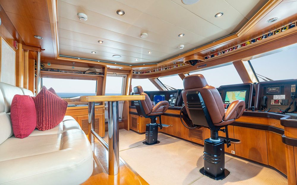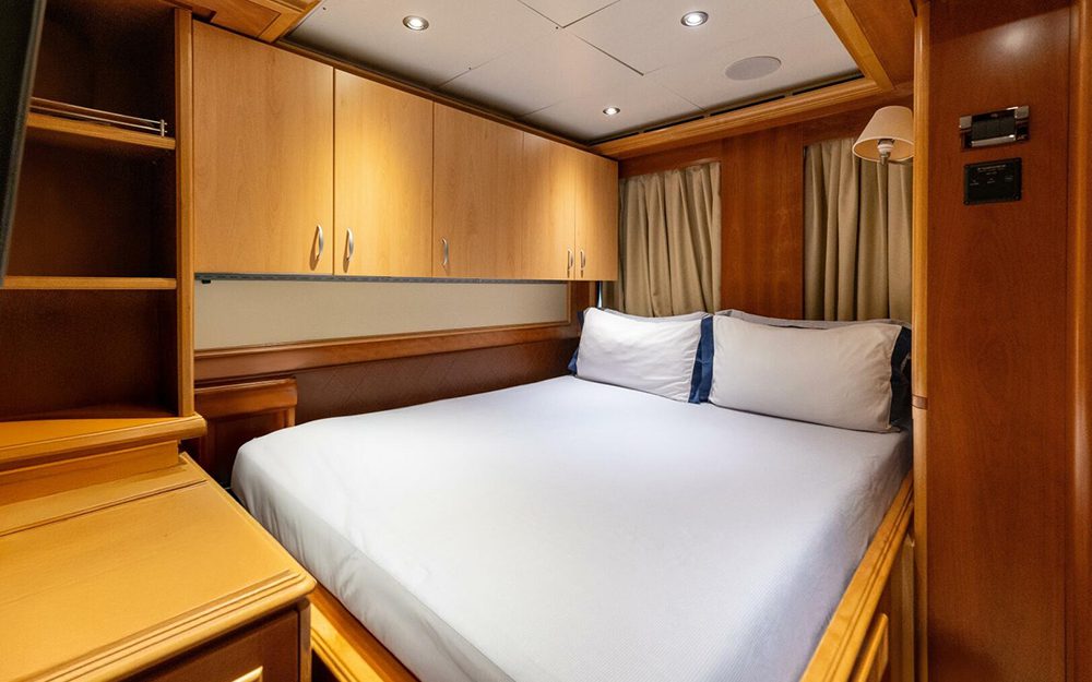 The large captain’s cabin is located aft of the bridge on the port side with a queen berth, private head, shower, sink, storage and closet and a separate Captain’s office.