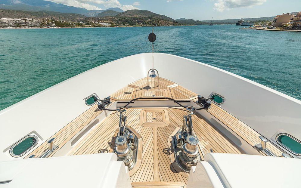 From the aft deck, there are steps leading down to the swim platform, beach club, or up to the upper decks. Walkaround decks port and stb’d lead to the Portuguese bridge seating and access to the foredeck. The port side is used for crew access, while the starboard side features an owner’s foyer.